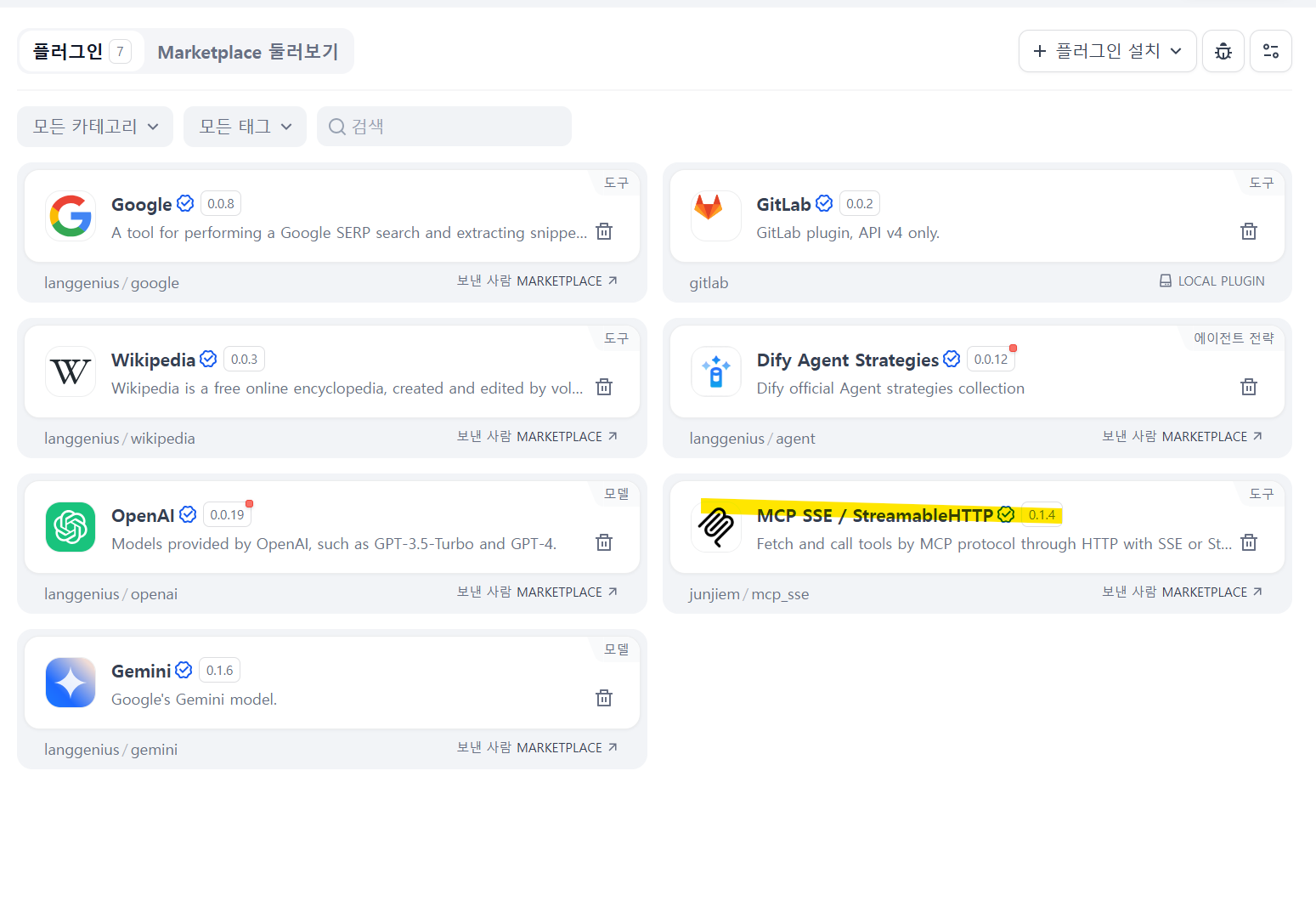Dify에서 MCP 를 사용하기 위해서는 플러그인 ‘MCP SSE’를 설치해야 합니다.